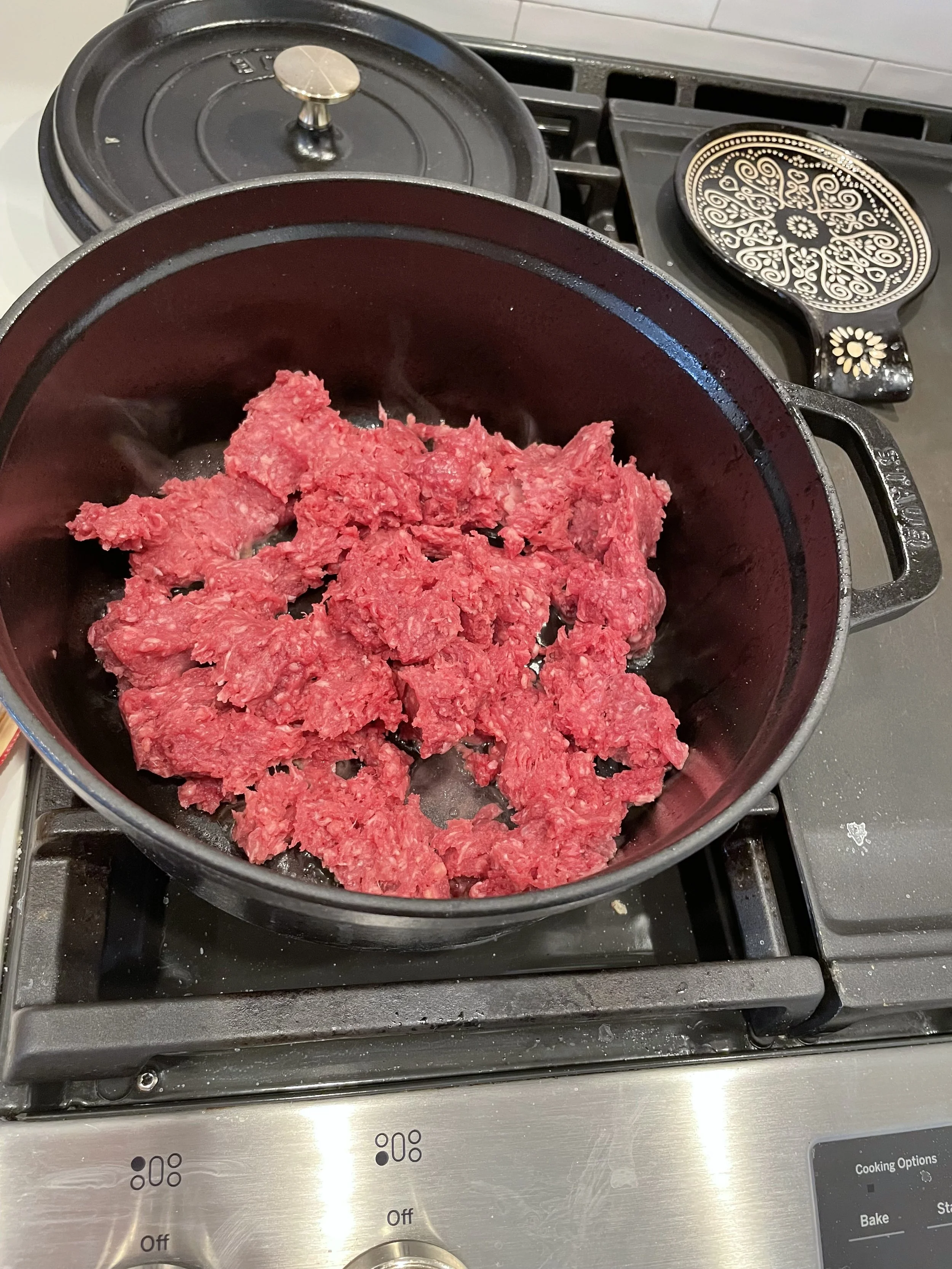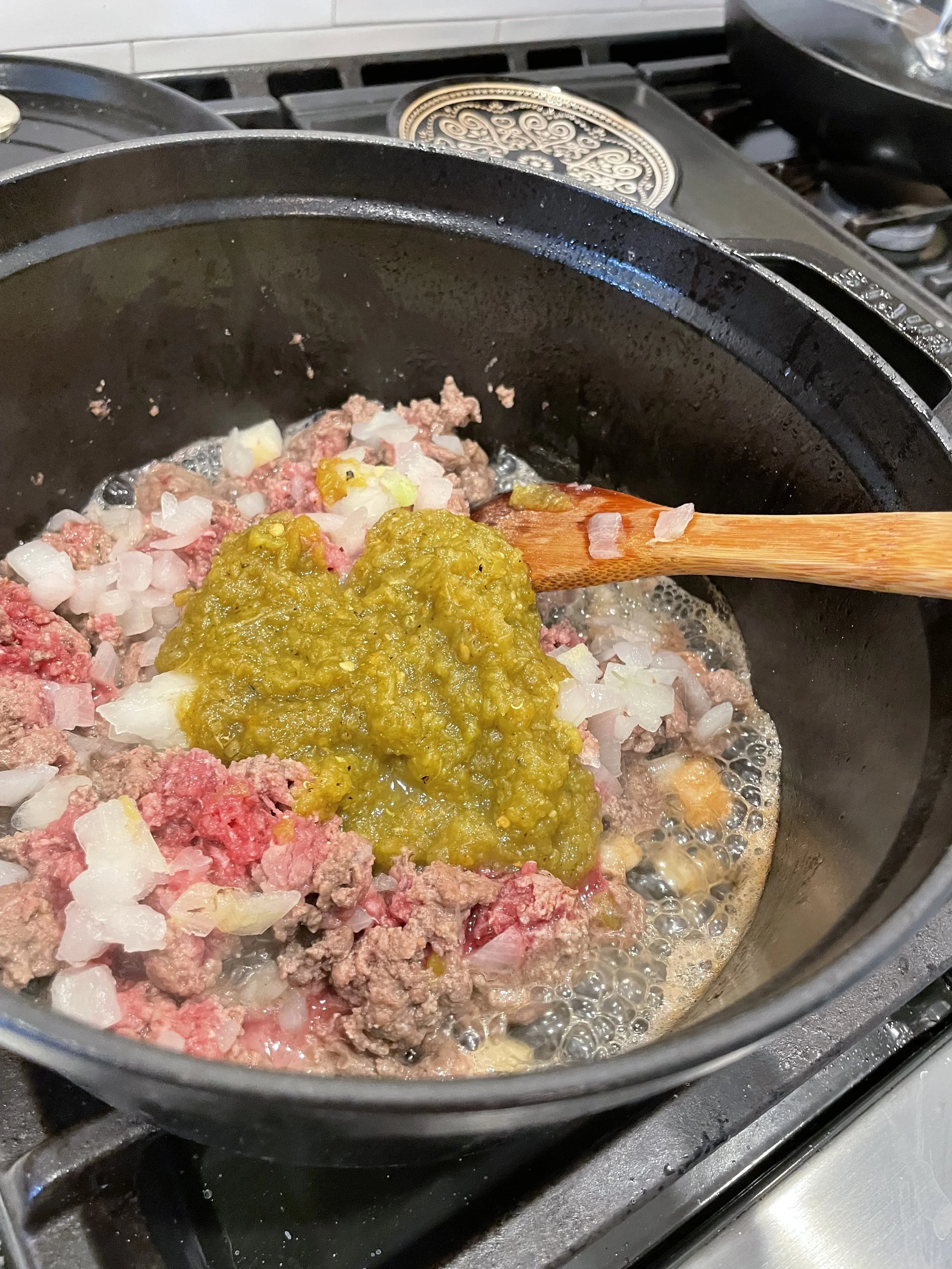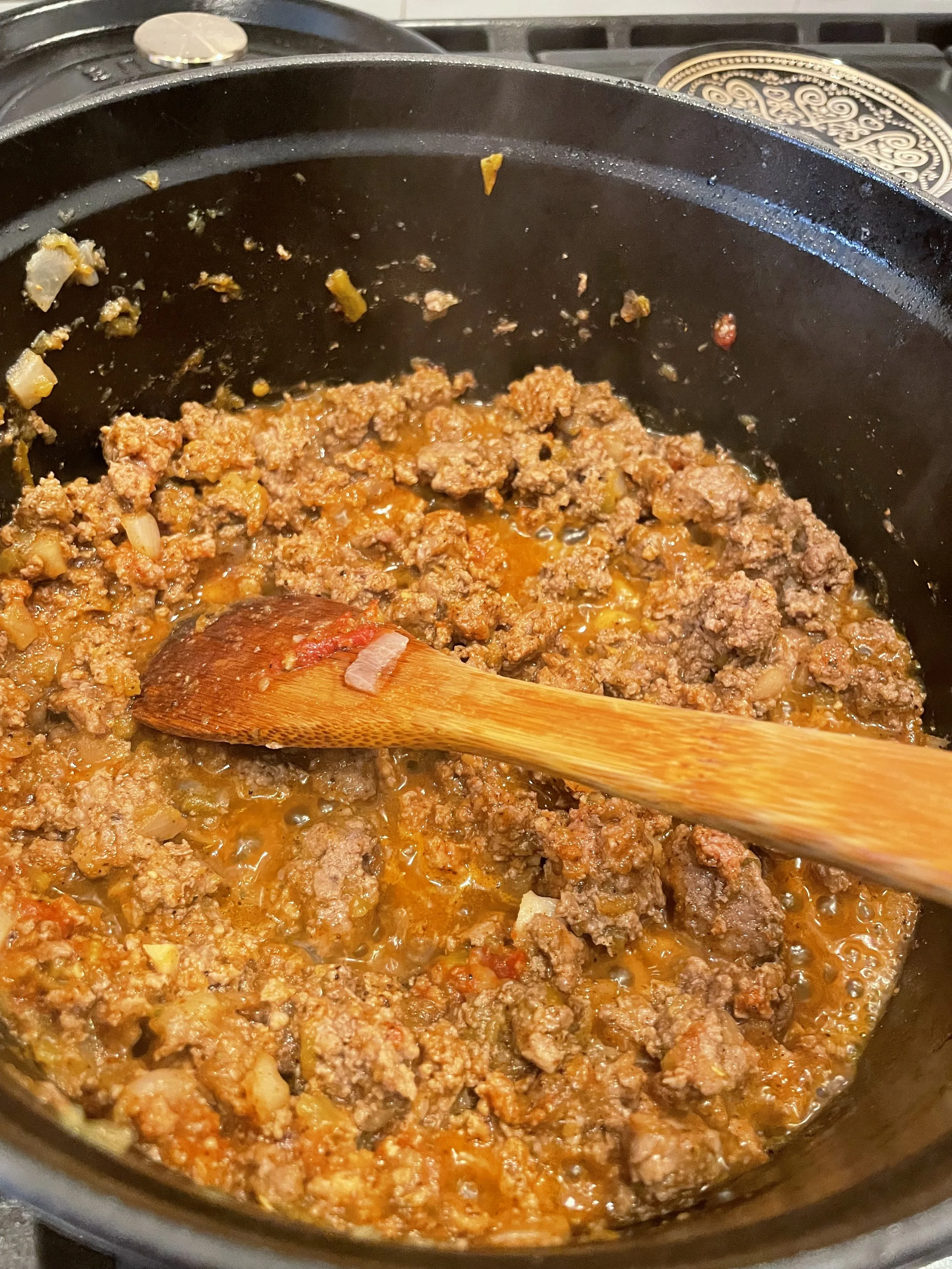 As it browns, add onions, chopped green chilis and garlic (note, someone forgot garlic) also Salt, pepper and oregano.
